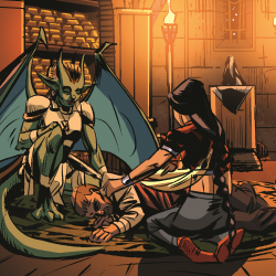 While Magni is quick to make up for lost time, Angelika asks for just a moment more apart, seeking out the storyteller. The mature gargoyle shares her interest in the young lady's craft, believing that storytelling to be as vital for a soul as breathing is for a body. Clasping the gargoyle's hands, Shahrizad heartily agrees, telling Angelika – by name – that she must have her own interesting stories to tell that shouldn't be lost.