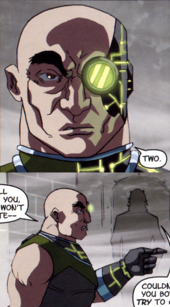 Duval appears as a bald, muscular human with cybernetic implants - specifically his left eye, and at least one of his hands. How he acquired these implants is, as yet, unknown.
