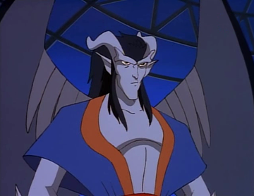 Yama has grey skin, black hair, and two pairs of curved horns. He has a blade on the end of his tail and blade-like spikes on his forearms. His wings are unusual, with no claws on the wrists, and strange markings that look like feathers.