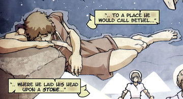Jacob appears in the Book of Genesis as the son of Isaac, grandson of Abraham, and twin brother to Esau (though Esau was the older of the two). He was a trickster who first persuaded Esau to trade the birthright that was due him as the older son in return for some stew ("pottage", in the King James Version), and then disguised himself as Esau to dupe an elderly Isaac into bestowing the blessing meant for Esau upon him. Esau was understandably angry about this, however, and Jacob fled to his uncle Laban in Haran to escape Esau's wrath, along the way having his famous experience at Bethel.