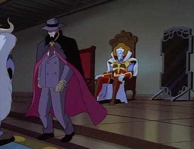 During the production of "The Gathering" Part One, tight schedules meant that there was not enough time to choose and design the mythological characters that should have attended the Gathering. Therefore, in additions to the Children of Oberon that had appeared in earlier episodes (e.g. Odin, Banshee, Raven, etc.), the scene was populated by random designs (and perhaps a few designs reused from "The New Olympians", for which there had been similar problems). One of these random designs was the caped figure who greeted Oberon just before Odin.[1] When asked about this mysterious character on Ask Greg, Greg Weisman responded, "He's Nobody or Nought. And he's greeting Oberon, just like everyone else."[2] The name Nought stuck. Greg now has plans for the character in future stories, as well as some notions of connecting him to a couple of mythological figures.[3][4]